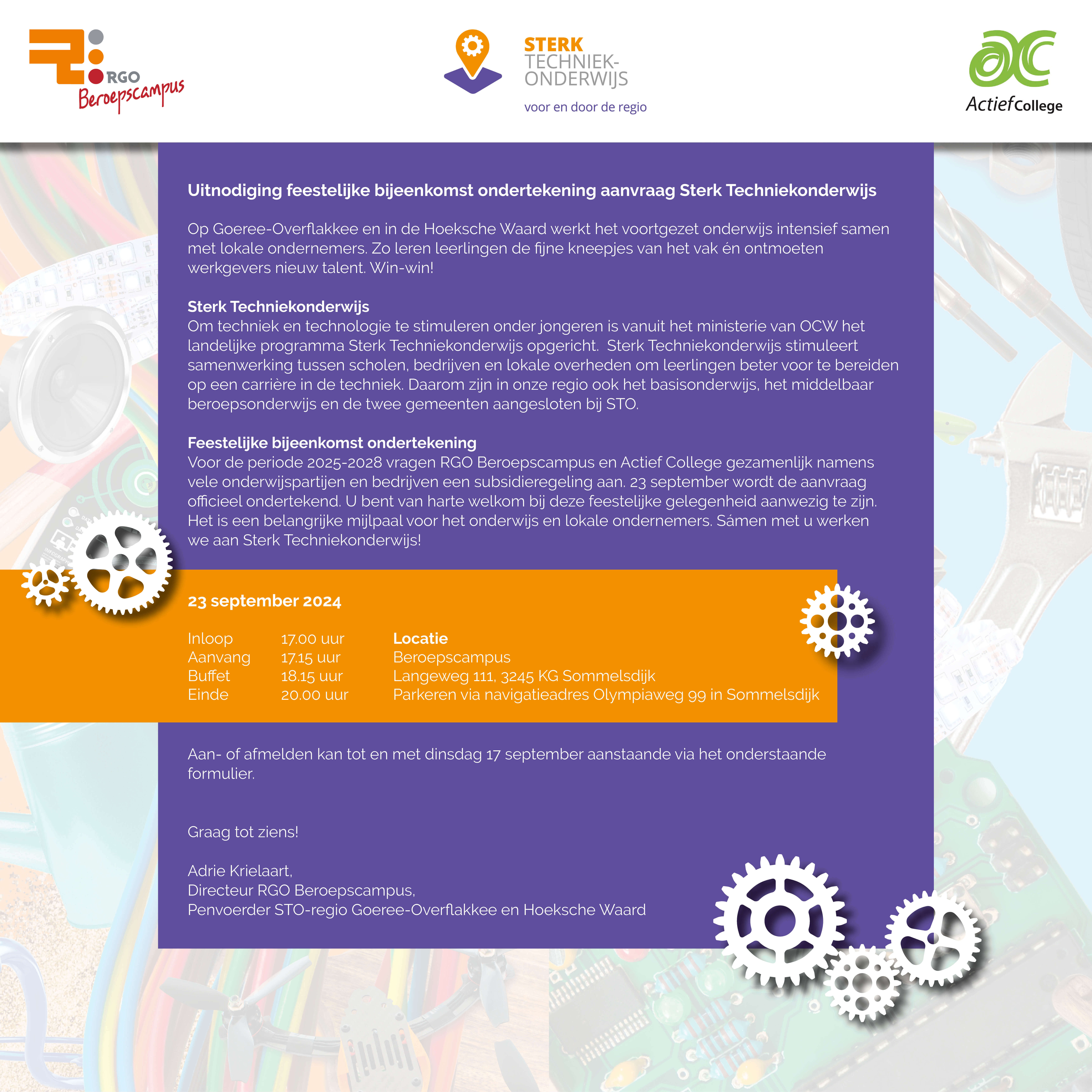 Feestelijke ondertekening aanvraag Voor de periode 2025-2028 vragen RGO Beroepscampus en Actief College gezamenlijk namens vele onderwijspartijen en bedrijven een subsidieregeling aan. 23 september wordt de aanvraag officieel ondertekend tijdens een feestelijke bijeenkomst op de Beroepscampus. Een belangrijke mijlpaal voor het onderwijs en lokale ondernemers. Want sámen werken we aan Sterk Techniekonderwijs!
